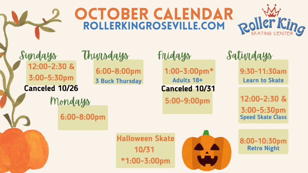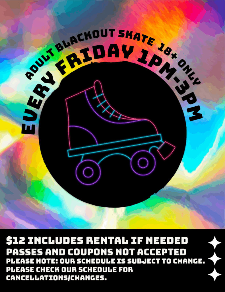 - 1:00 – 3:00pm | Adult Blackout Skate (18+) | $12.00 includes rentals *canceled 10/31